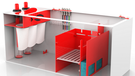 The Red Flex Reef Sump is designed specifically for saltwater systems. This sumps features a modern red and white acrylic design. Water flows through the two overflow ports, into our proprietary bubble diffusers and through the 4 inch 200 micron filter socks. Each sump includes an overflow panel where the water can escape into the sump if your socks overflow. The Red Flex is equipped with a dosing, probe and wire holders, easily maintained by the built in fastener. Water levels exiting the refugium chamber can be adjusted between 6 to 9 inches via the adjustable flow gate, depending on your specific needs. It also Includes flexible hoses, 4 inch Micron bags and the foam block sponge.